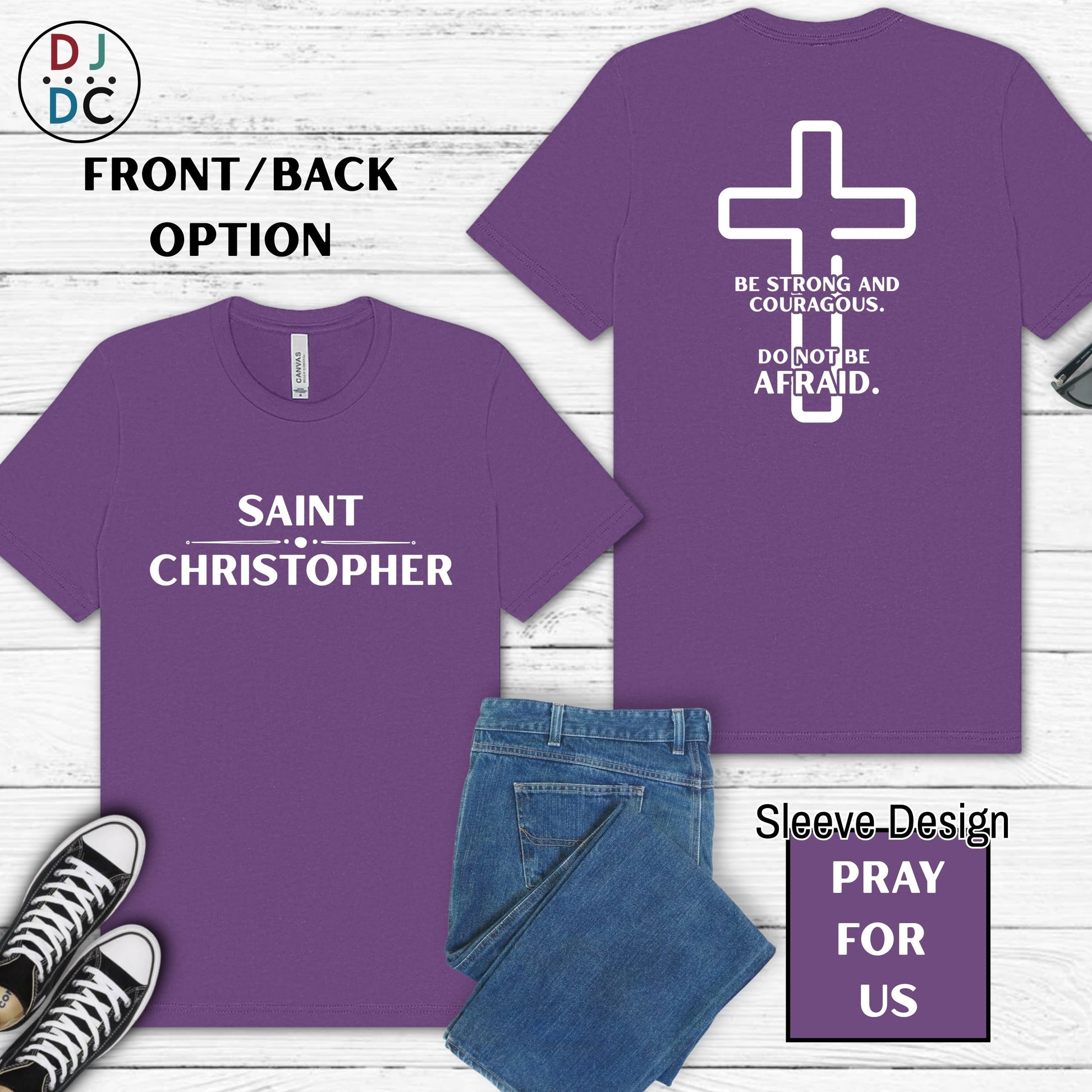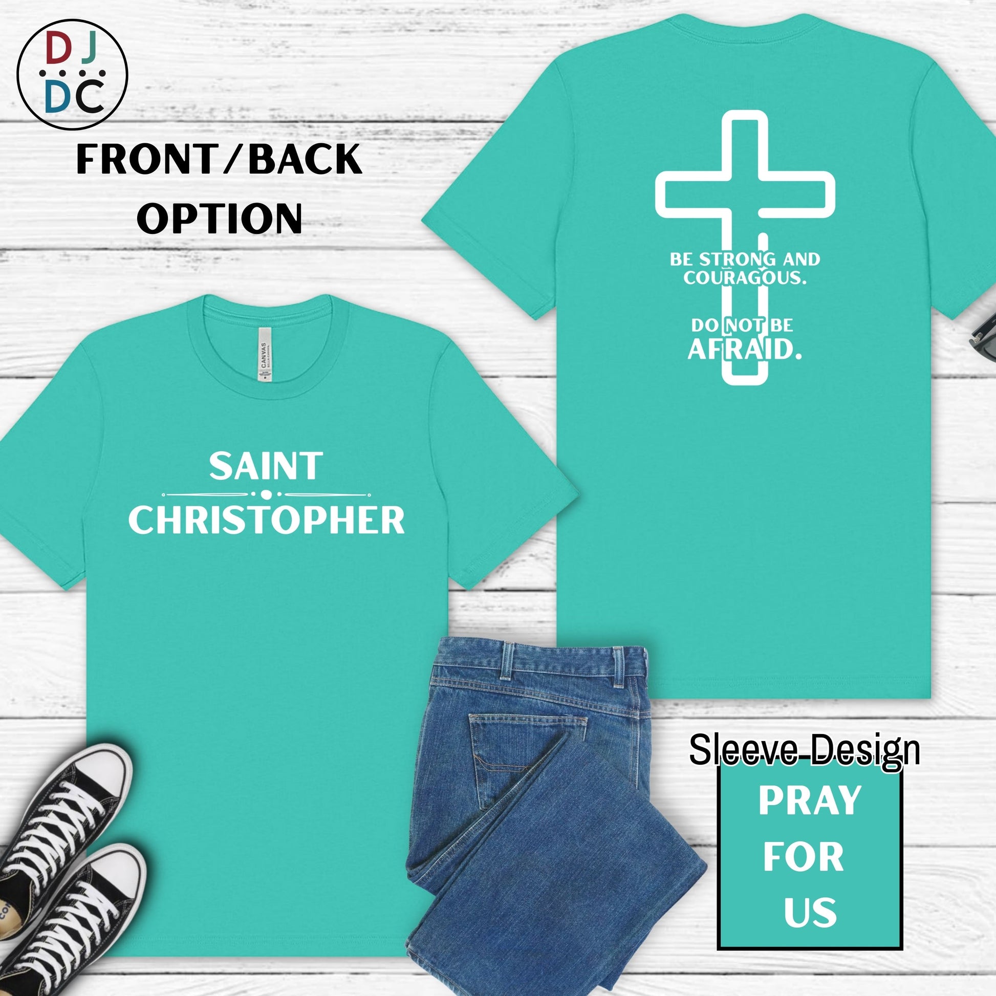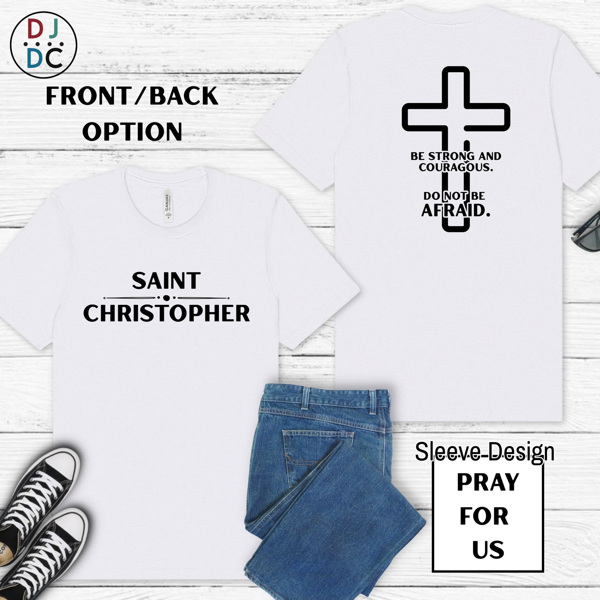 This Saint Christopher shirt is a wearable prayer inspired by his strength, courage, and faithful protection on life’s journeys. Featuring Saint Christopher on the front and PRAY FOR US on the sleeve, it invites his intercession into everyday moments. The optional back print displays the encouraging words, “Be strong and courageous. Do not be afraid,” making this a meaningful Catholic gift, Saint Christopher shirt, and Confirmation gift for travelers, drivers, and those seeking courage and protection.
