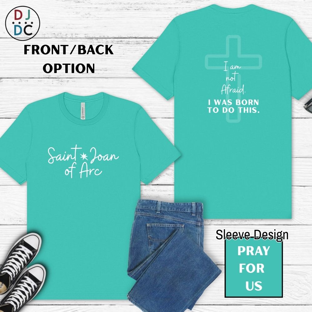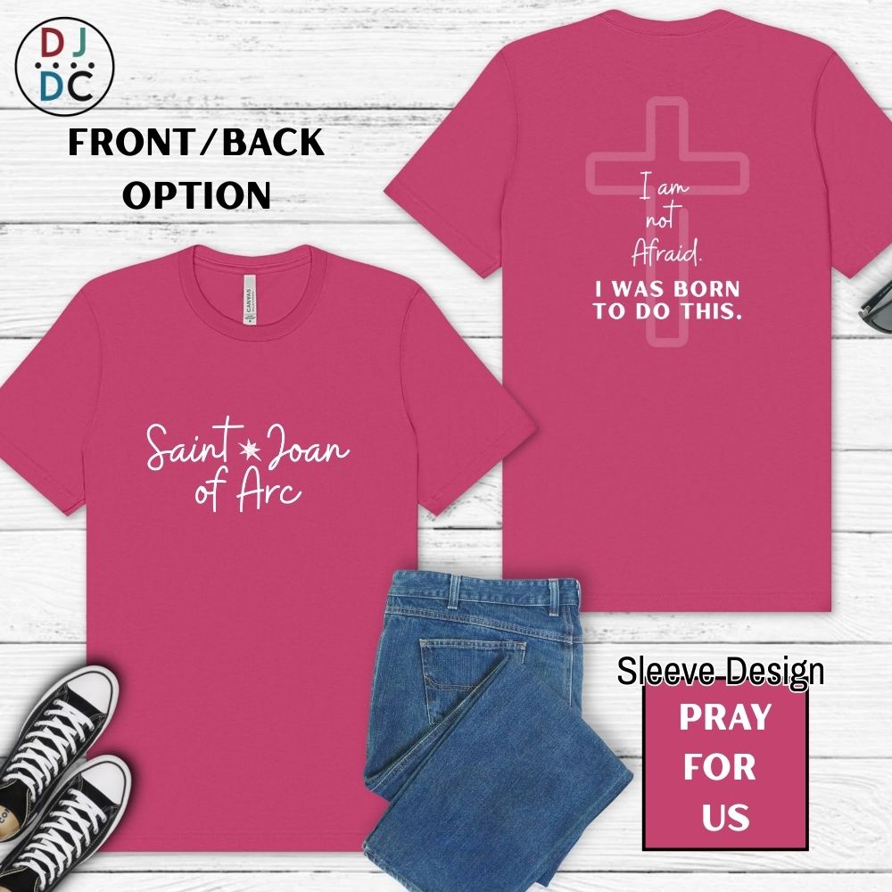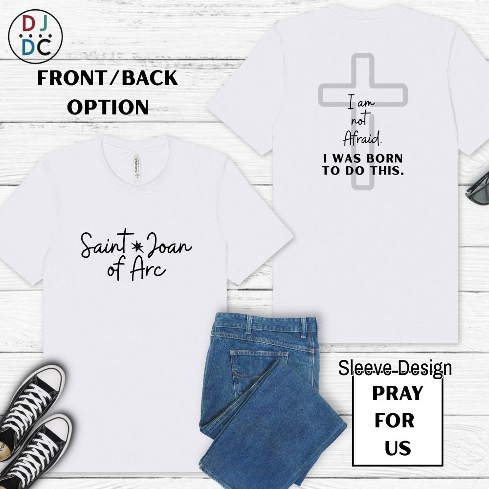 This Saint Joan of Arc shirt is a wearable prayer inspired by her courage, conviction, and fearless obedience to God’s call. Featuring Saint Joan of Arc on the front and PRAY FOR US on the sleeve, it invites her intercession into daily life. The optional back print displays her powerful declaration, “I am not afraid. I was born to do this,” making this a meaningful Catholic gift, Saint Joan of Arc shirt, and Confirmation gift for those seeking strength, bravery, and faith-filled confidence.