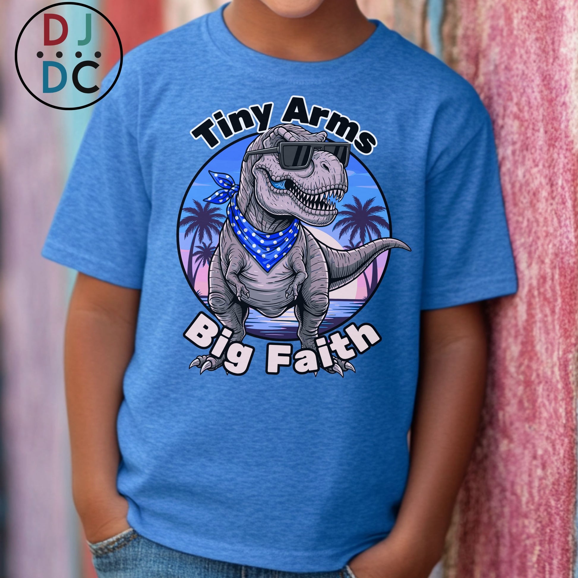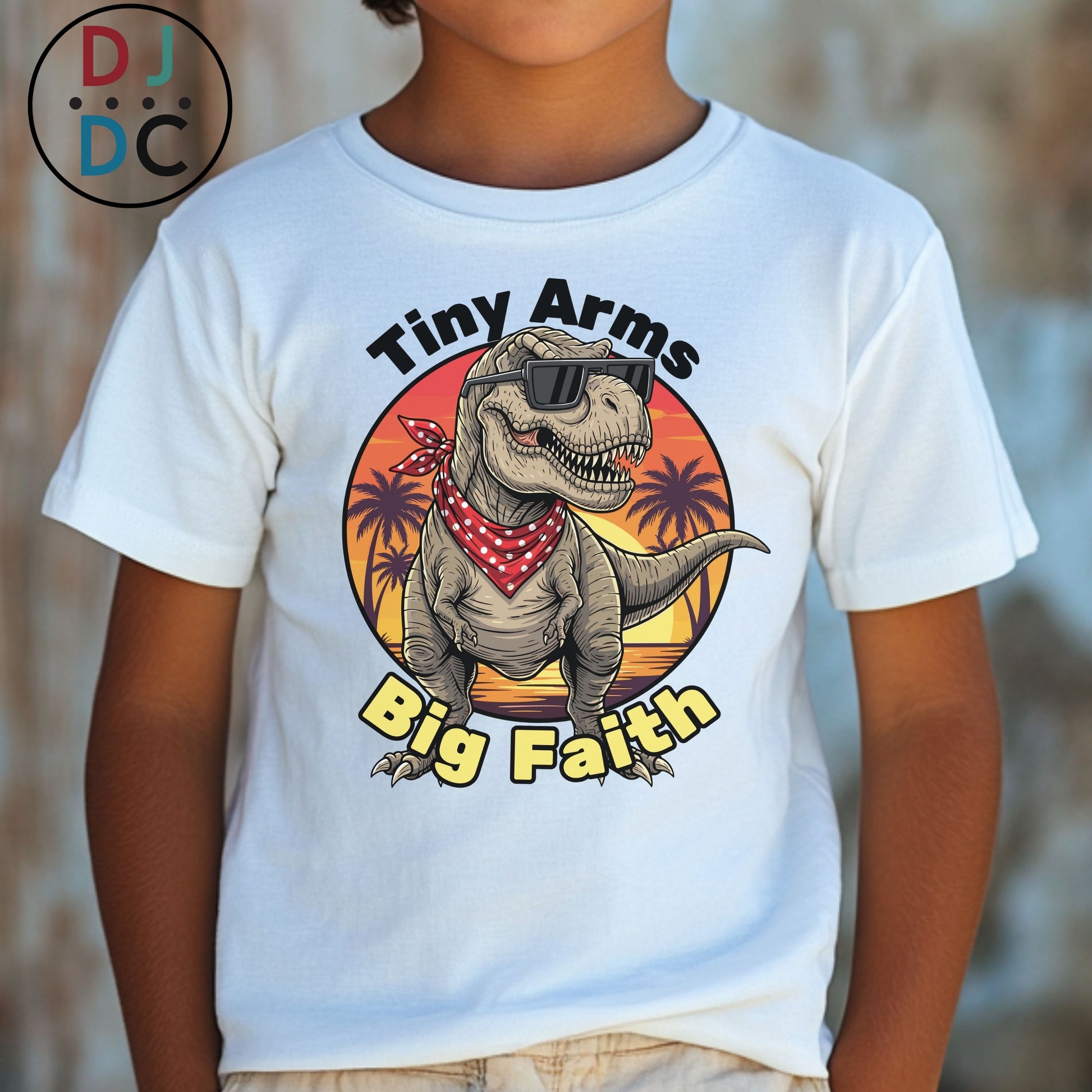 It’s a great conversation starter for church events, youth group, school, or everyday wear. Kids love the silly dino, and adults love the message — faith doesn’t depend on size, strength, or having it all together. It’s about trusting big, even when you feel small.
