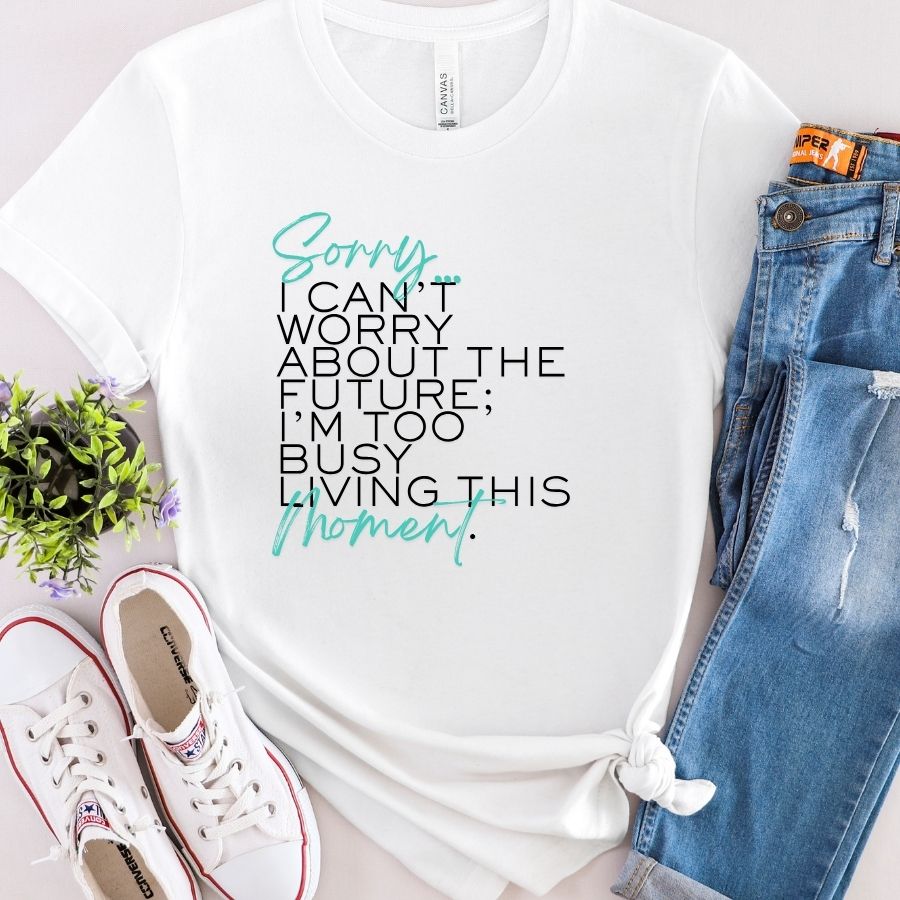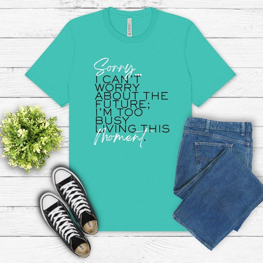 This feel-good graphic tee is a faith-filled reminder to stop stressing and start living. Featuring the phrase “Sorry, I can’t worry about the future… I’m too busy living this moment,” this Christian graphic shirt brings a little humor, a lot of peace, and an everyday nudge to trust God with what’s next. Soft, comfy, and easy to wear, it’s a fun faith-based tee, Catholic gift, and Christian apparel favorite for everyday life, church days, coffee runs, and anyone choosing faith over fear.